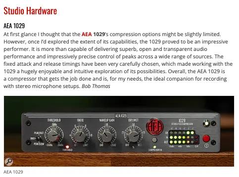 起初,我曾认为 AEA 1029 压缩器的压缩调节功能略显局限。但深入挖掘其全部性能后,这款设备的表现不错 —— 它不仅能呈现出很不错的、开阔通透的音频表现,还能针对各类音源实现为精准的峰值控制。设备预设的固定启动时间与释放时间经过精心调校,让我在使用 AEA 1029 的过程中,能直观且愉悦地探索其丰富功能潜力。总而言之,AEA 1029 是一款实用性拉满的压缩器,就我的使用需求而言,它是立体声麦克风录音配置的理想搭档。—— 鲍勃・托马斯(Bob Thomas)